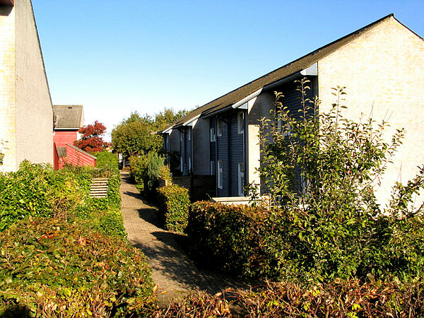 Hyggeligt boligområde med grønne arealer med legepladser og fodboldbane.