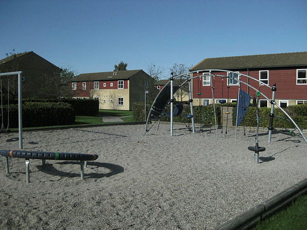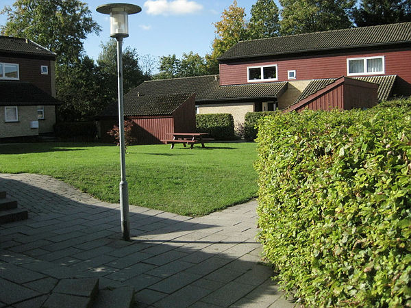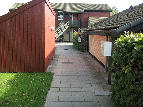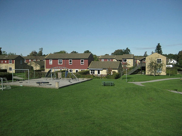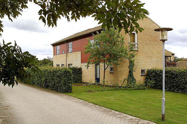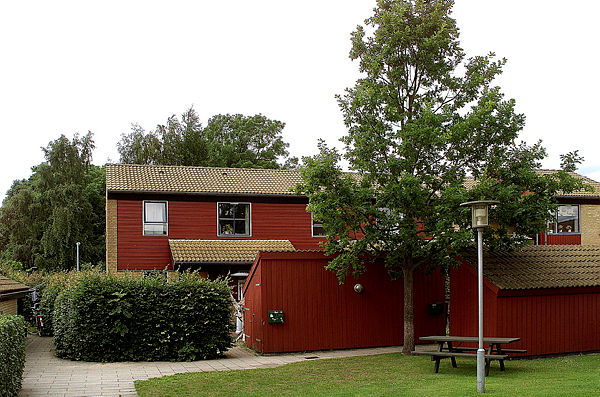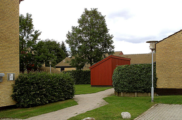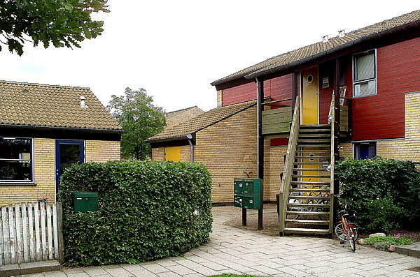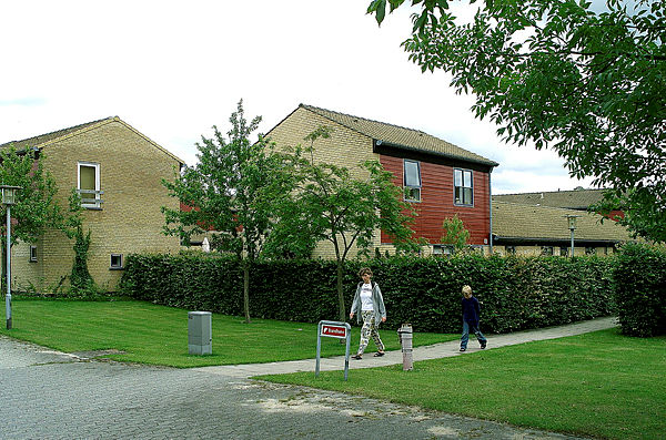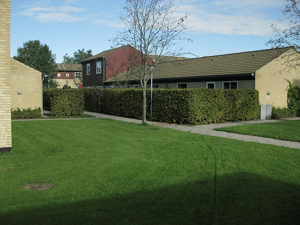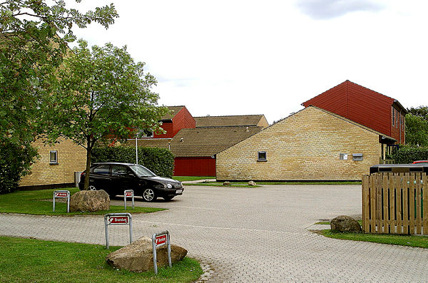Der er fællesvaskeri, fælleshus og parkeringsplads.
